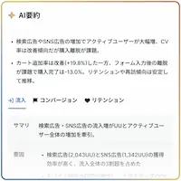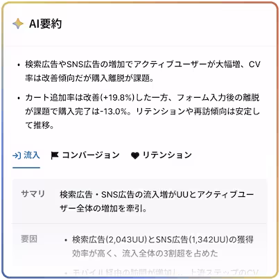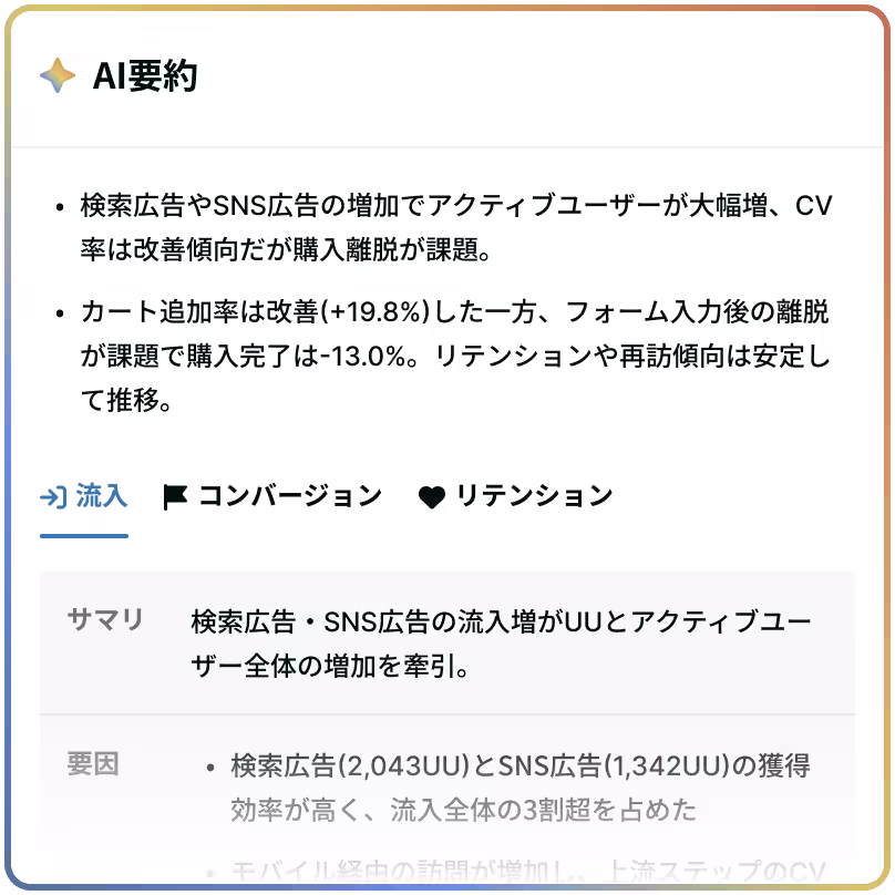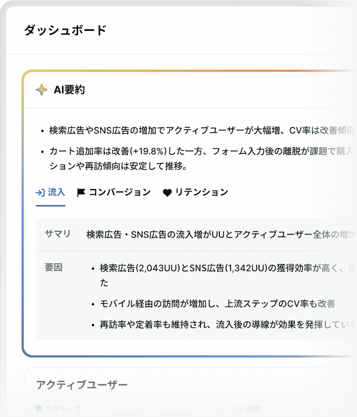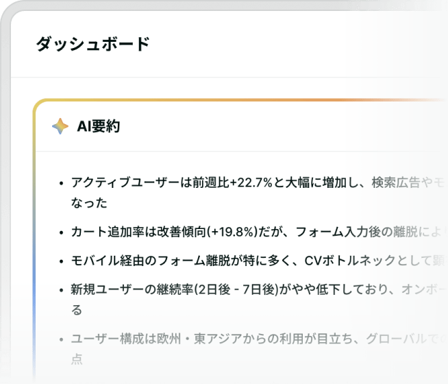 ウェブサイトの流入・コンバージョン・来訪頻度をひと目で把握。AIが変化を検知し、要因を解析。