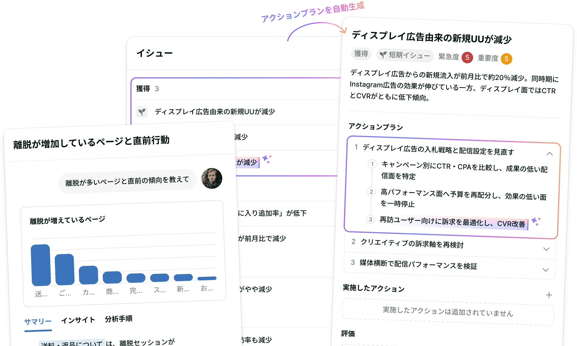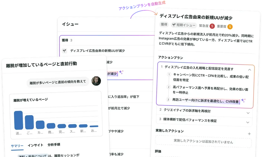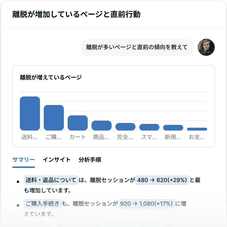 「数字を拾う」「理由を探る」「次の打ち手を考える」までの分析体験を、会話で短縮します。