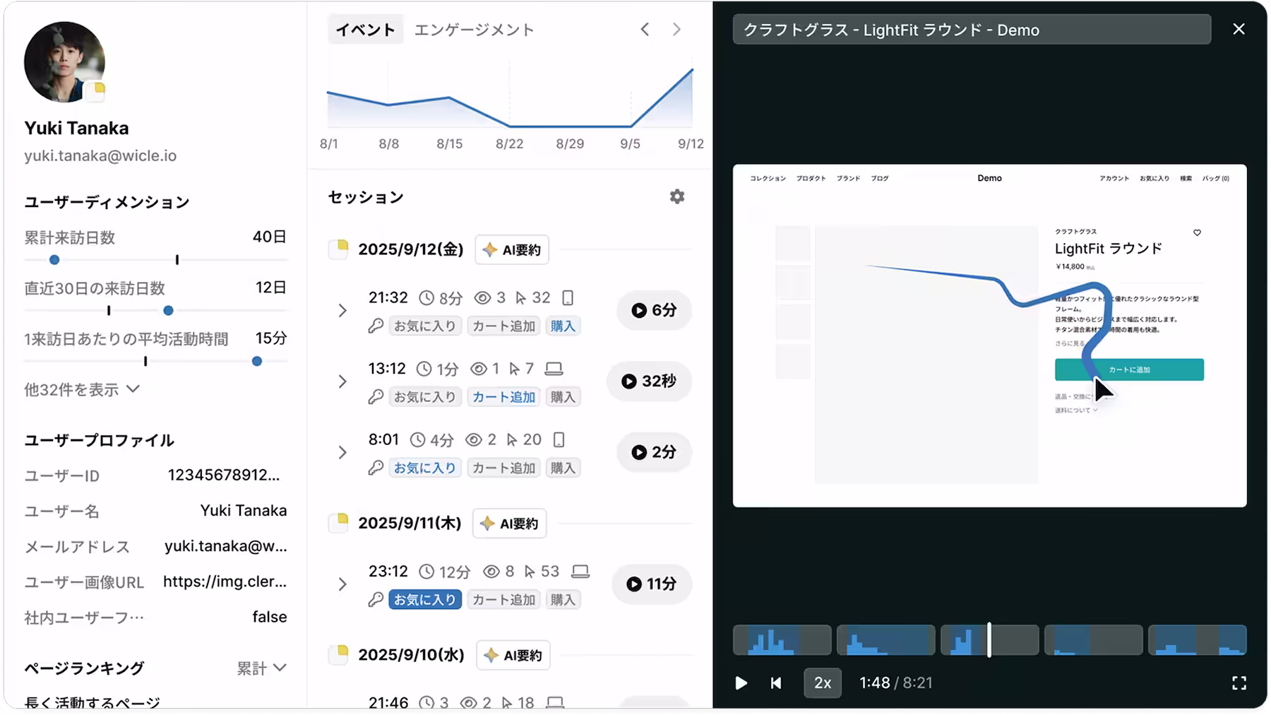 ユーザー属性や流入別の行動傾向を把握し、行動履歴と動画から背景を探索できます。